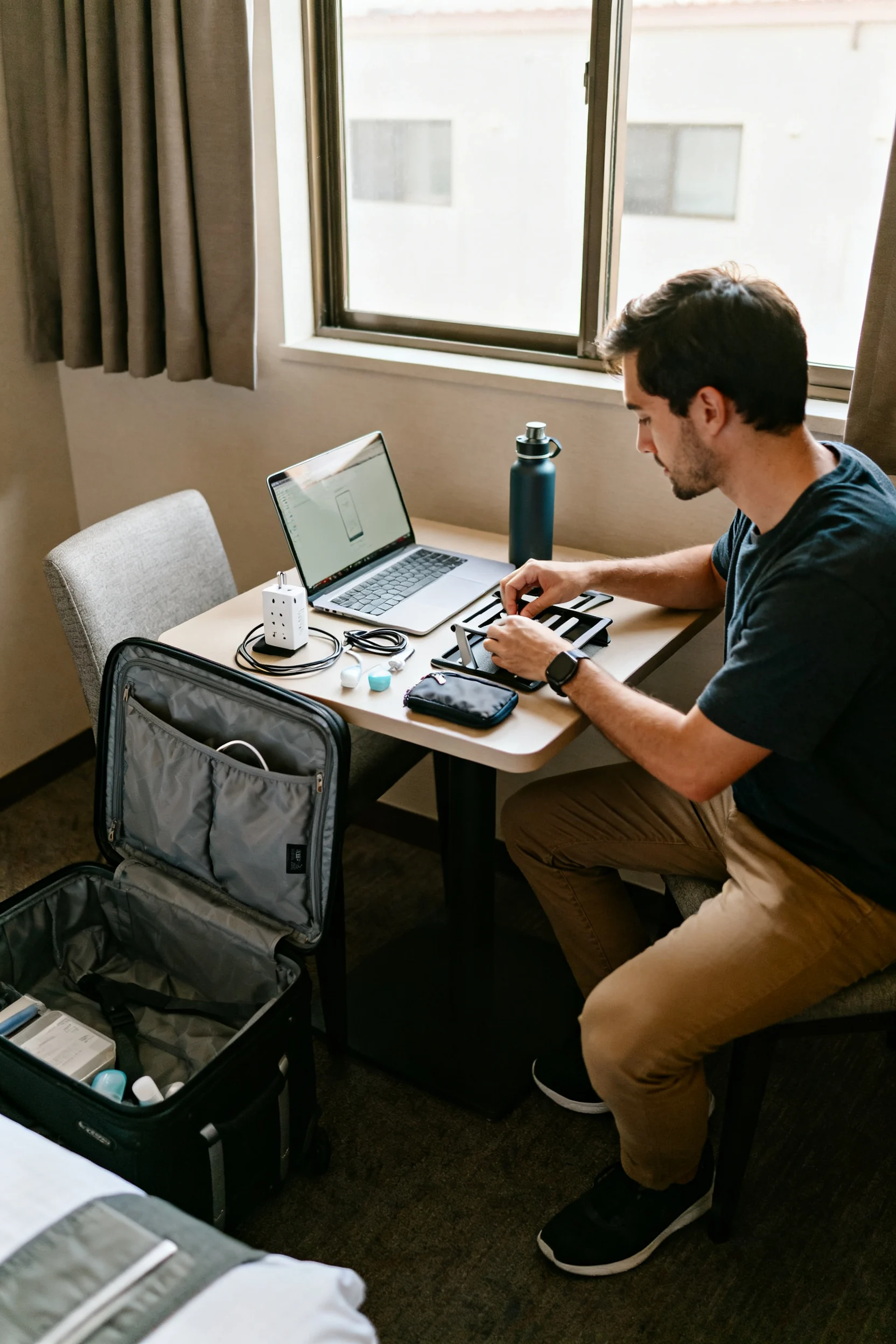 Your goal is portability: bring a universal adapter, a compact extension cord, and a lightweight laptop stand if you’ll be working long hours. Add a reusable water bottle and a small toiletry pouch you can toss into a day bag for coworking days. If you’re hopping between cities, keep everything work-related in one packing cube so airport days don’t turn into “where is my charger” drama.