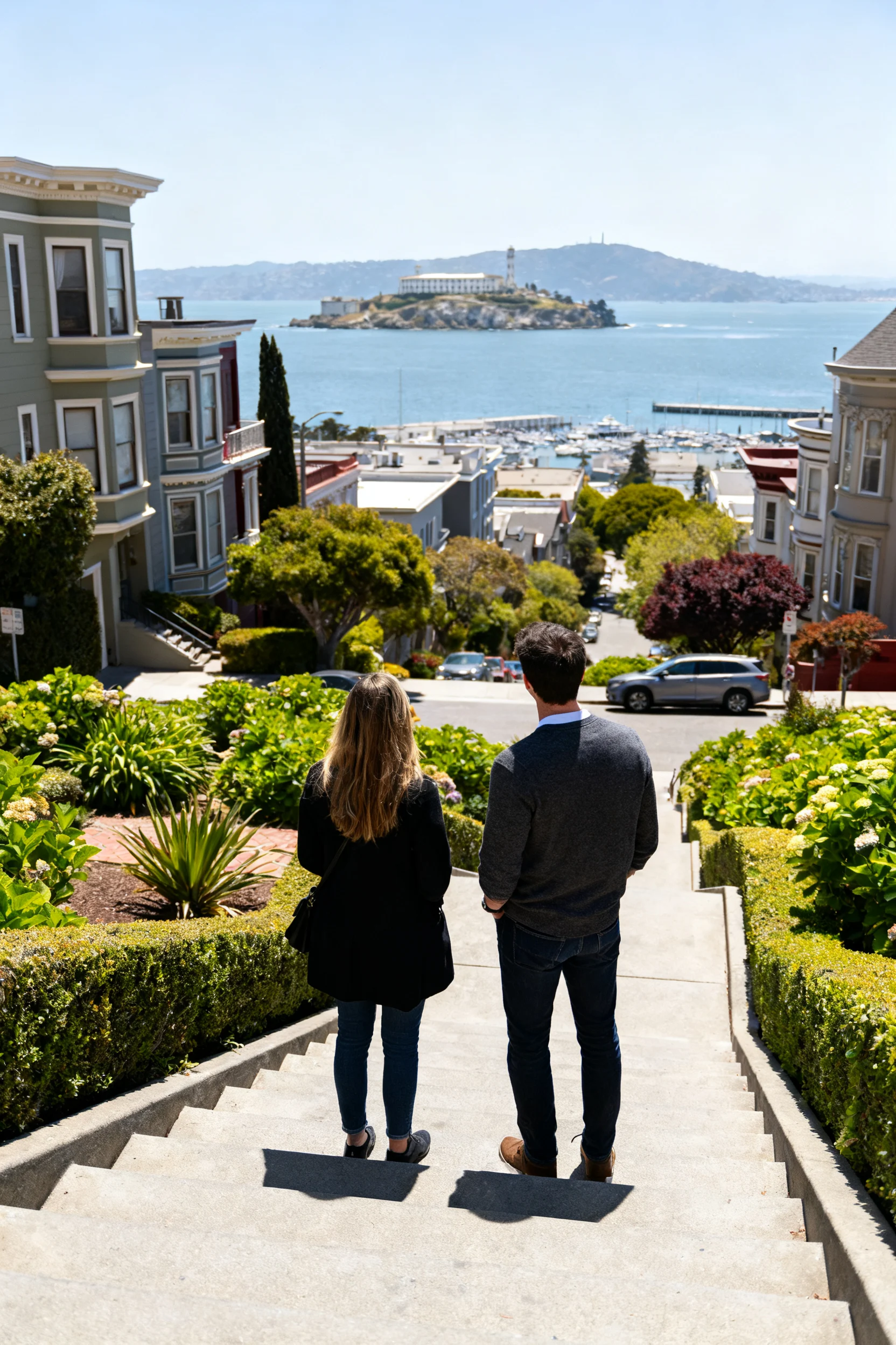 These steps are your mini workout with a payoff: postcard views of the bay, Alcatraz, and (on clear days) the Golden Gate. Start at the bottom near Green Street and pace yourself—there are multiple landings that make perfect photo stops. Go around sunset for that warm glow on the mansions, but avoid weekend midday when it turns into a fitness line. If you’re building a walking route, connect it with nearby Alta Plaza Park for extra viewpoints.