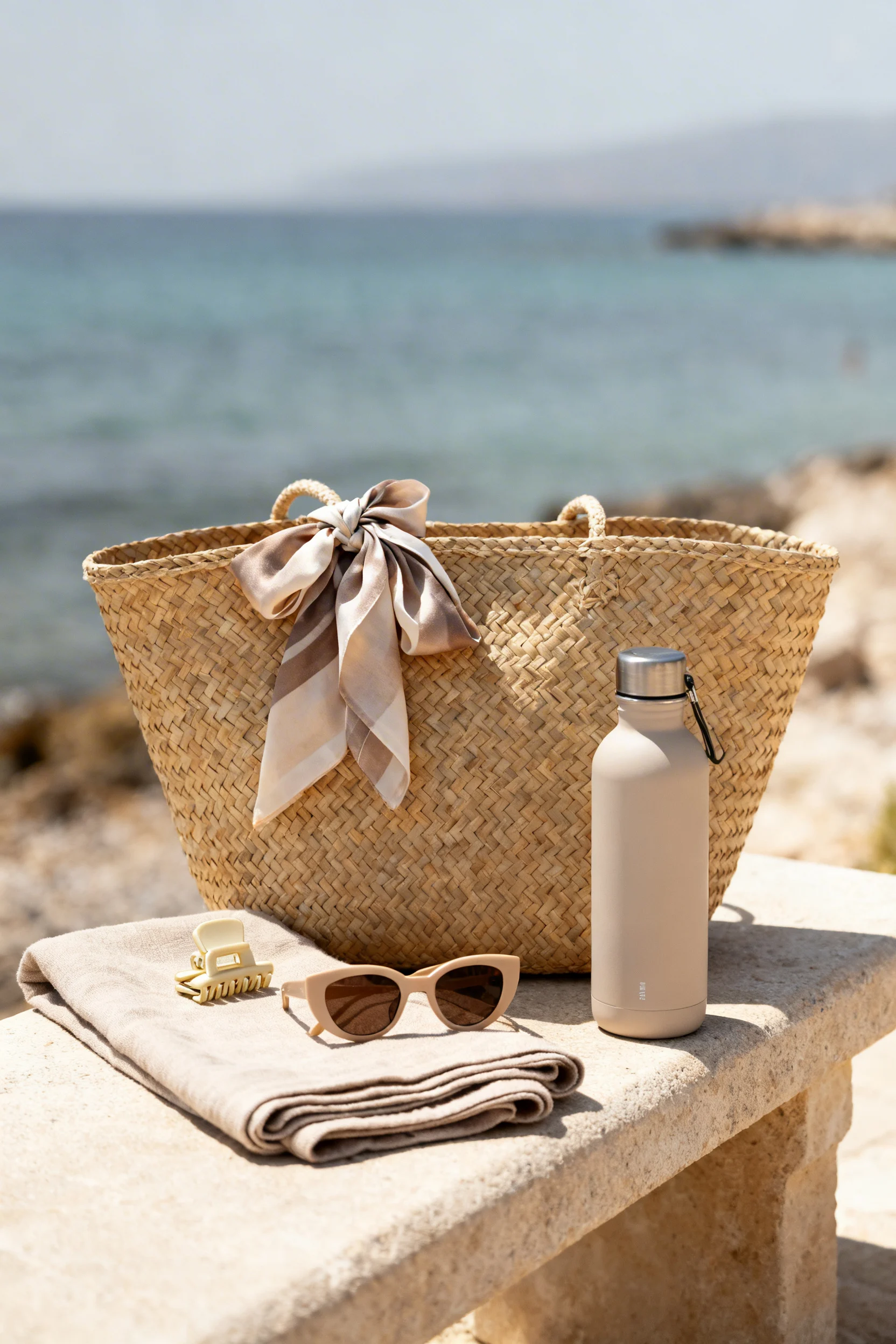 Keep it minimal but intentional: a straw tote, a silk scarf, a claw clip, and sunglasses you actually love. If you’re beach-bound, add a neutral sarong and a reusable water bottle that looks cute in photos. These small pieces make outfits feel styled and help you mix-and-match without overpacking.