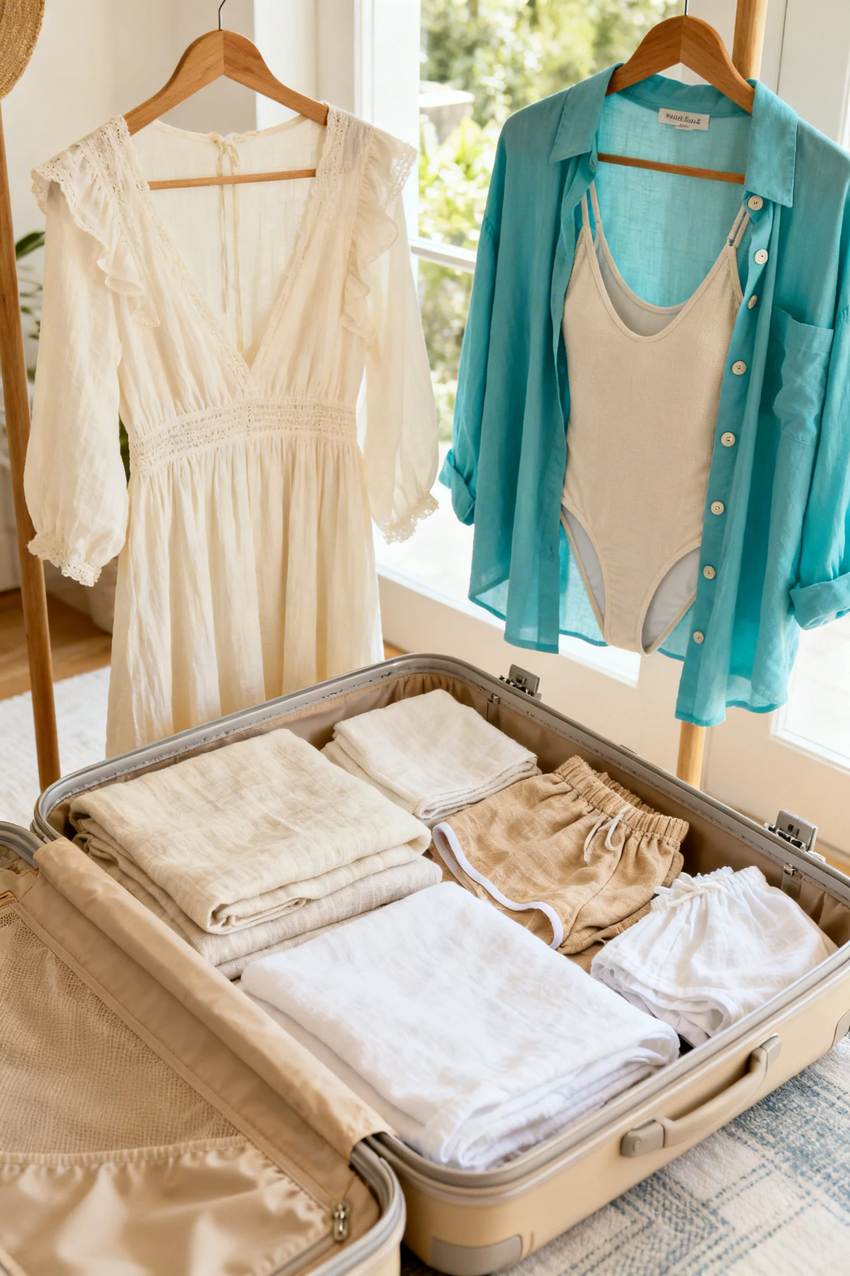 Pack a capsule wardrobe: 2 bottoms, 3 tops, 2 dresses/sets, 1 lightweight layer, 1 swimsuit, and 3 shoes (sandals, sneakers, dressy). Stick to a tight color palette so everything mixes. Wear your bulkiest shoes and layer on the plane to save space.