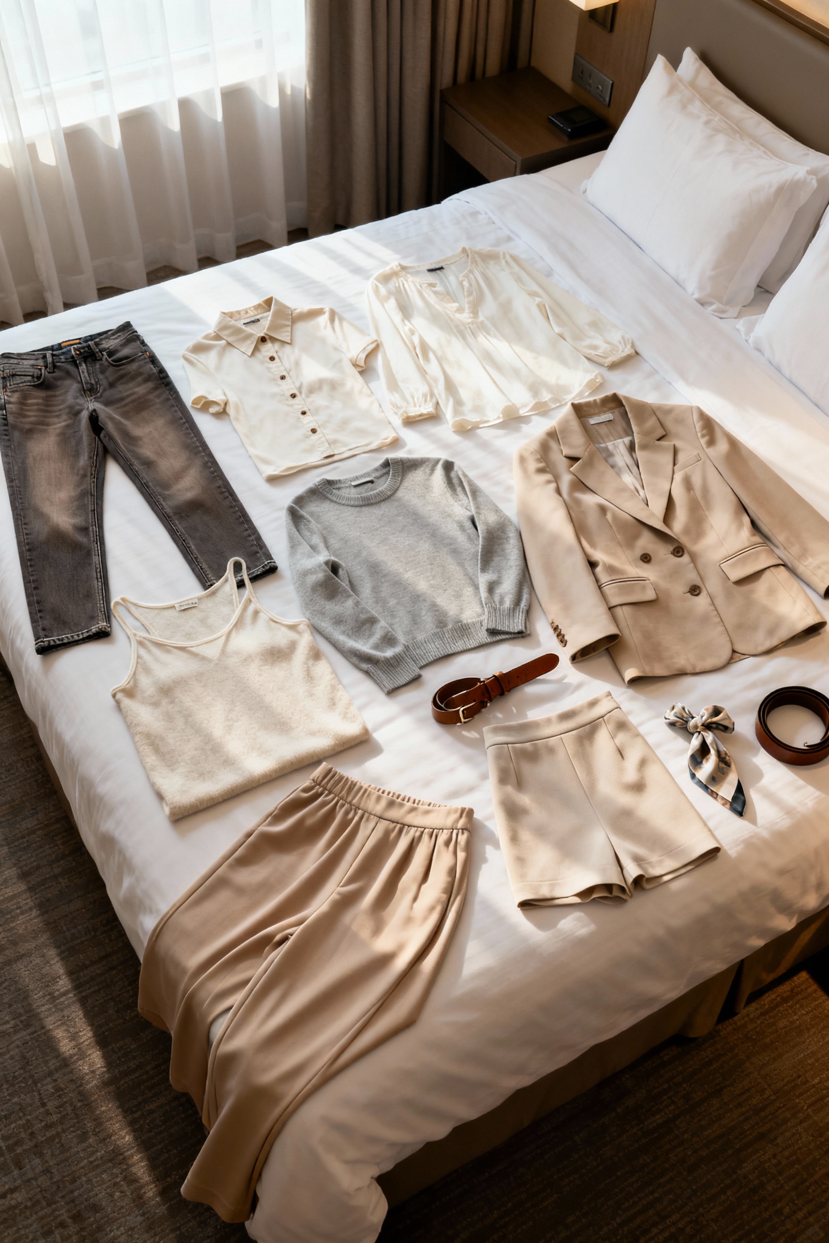 Aim for 10–12 core clothing pieces that all mix together: 2 bottoms, 4 tops, 1 warm layer, 1 nicer layer, 1–2 dresses/shorts (season-dependent), and sleepwear that can double as loungewear. Choose a tight color palette (neutrals + one accent) so everything matches without thinking. Pack fabrics that handle re-wears and dry fast (merino, blends, lightweight knits), and plan one “nice” outfit for dinners or clubs so you’re not stuck in the same look every night.