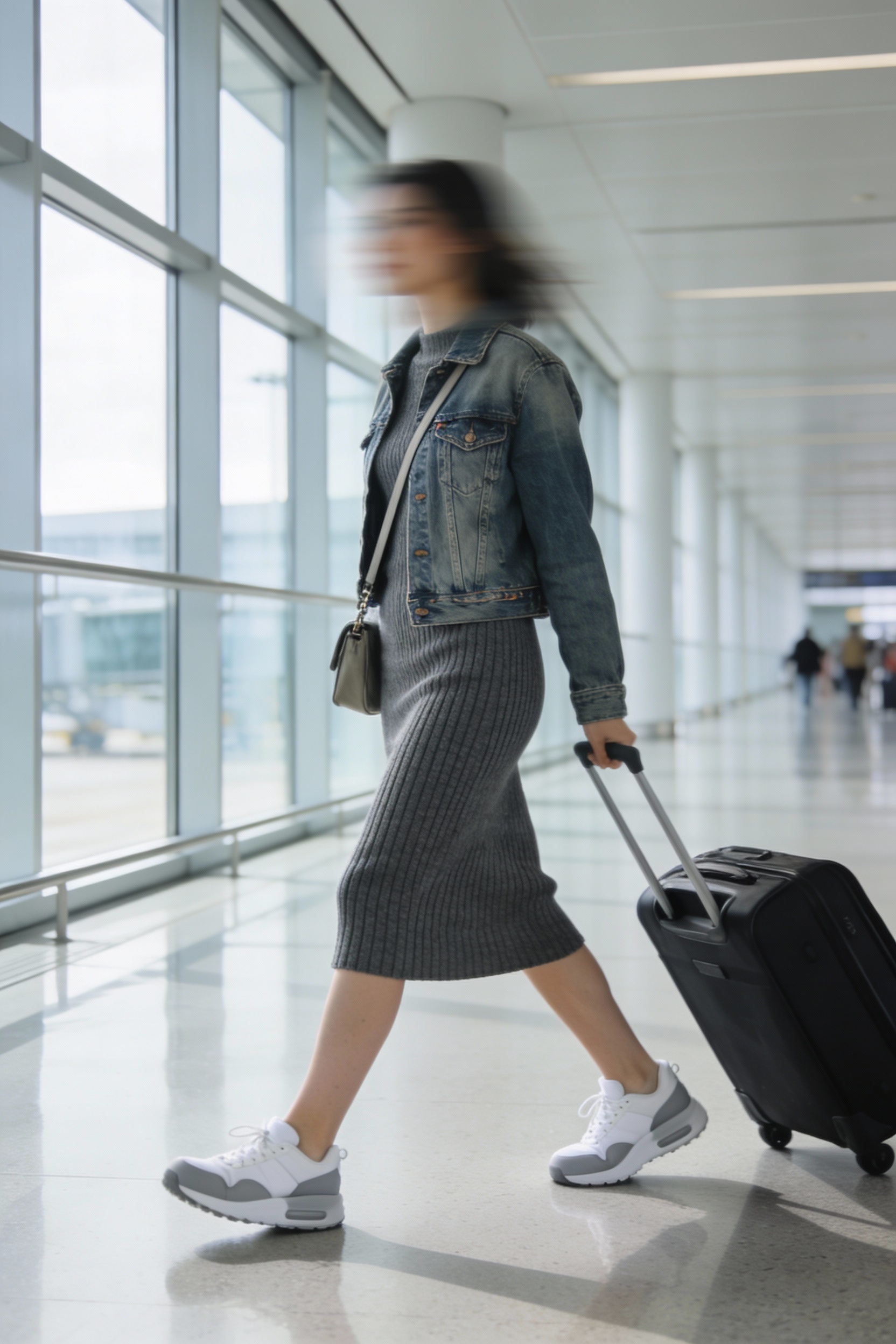 A jersey or ribbed knit midi dress is a travel secret: one piece, zero outfit planning, and it packs without drama. Throw on a classic denim jacket for warmth and a little structure, and wear cushioned trainers that can handle a long terminal walk. Choose a small belt bag worn crossbody for passport and earbuds, and add sunglasses as your accessory for that off-duty polish. Comfort tip: if cabins make you cold, tuck a thin long-sleeve tee into your personal item to layer under the dress without bulk.