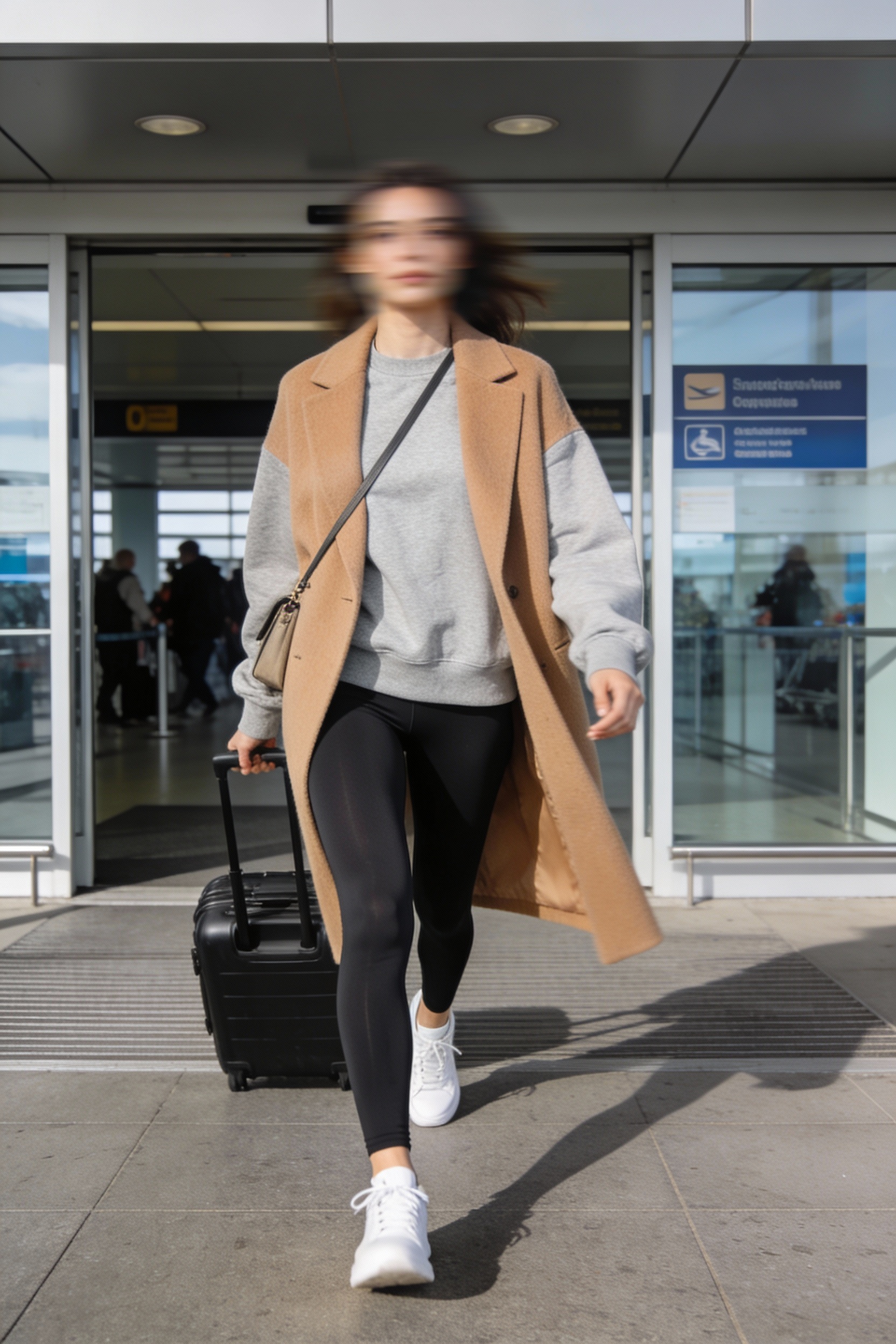 Choose thick, squat-proof black leggings and an oversized sweatshirt (or crewneck) for maximum comfort that still looks neat. Add a tailored wool coat as your outer layer to upgrade the whole outfit instantly, then wear supportive running shoes if you’re sprinting between gates. Carry a backpack with a luggage sleeve for easy stacking on your suitcase, and add a baseball cap as the accessory for low-effort, travel-day style. Weather tip: if your destination is warm, swap the wool coat for a long shacket and keep a light tank in your bag for landing.
