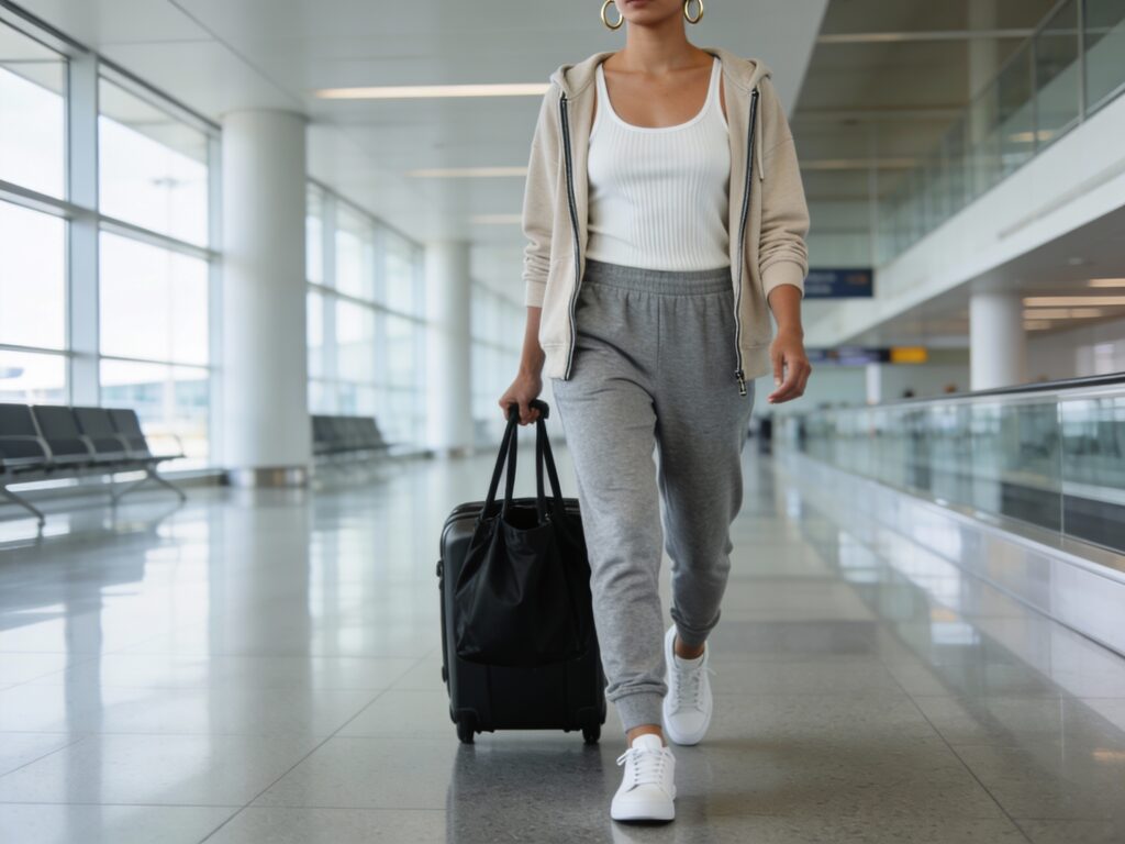 Go for a fitted ribbed tank or tee with tapered joggers, then add a lightweight zip hoodie or long cardigan for the cabin chill. Finish with clean white sneakers, a roomy tote or backpack, and simple hoop earrings to polish it up. For comfort, choose joggers with a soft waistband and a bit of stretch, and keep socks in your bag if you tend to get cold mid-flight.