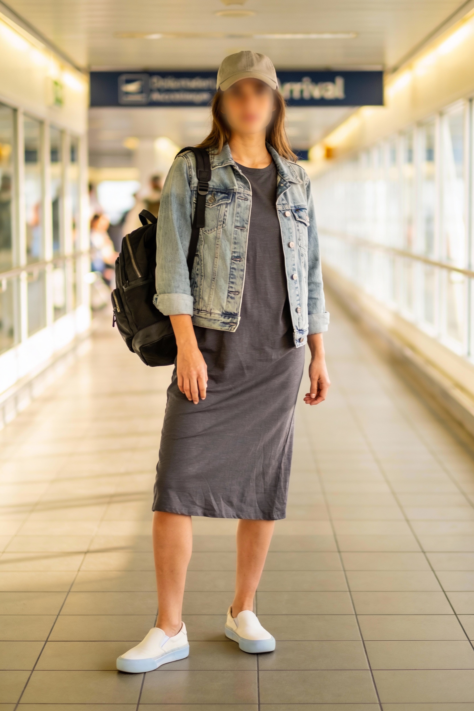Choose a midi t-shirt dress in cotton or a cotton-modal blend, then throw on a classic denim jacket for instant structure. Wear supportive slip-on sneakers, carry a compact backpack, and add a baseball cap for an easy, low-effort accessory. If you’re dealing with unpredictable weather, pack thin leggings in your personal item to layer under the dress once you land.