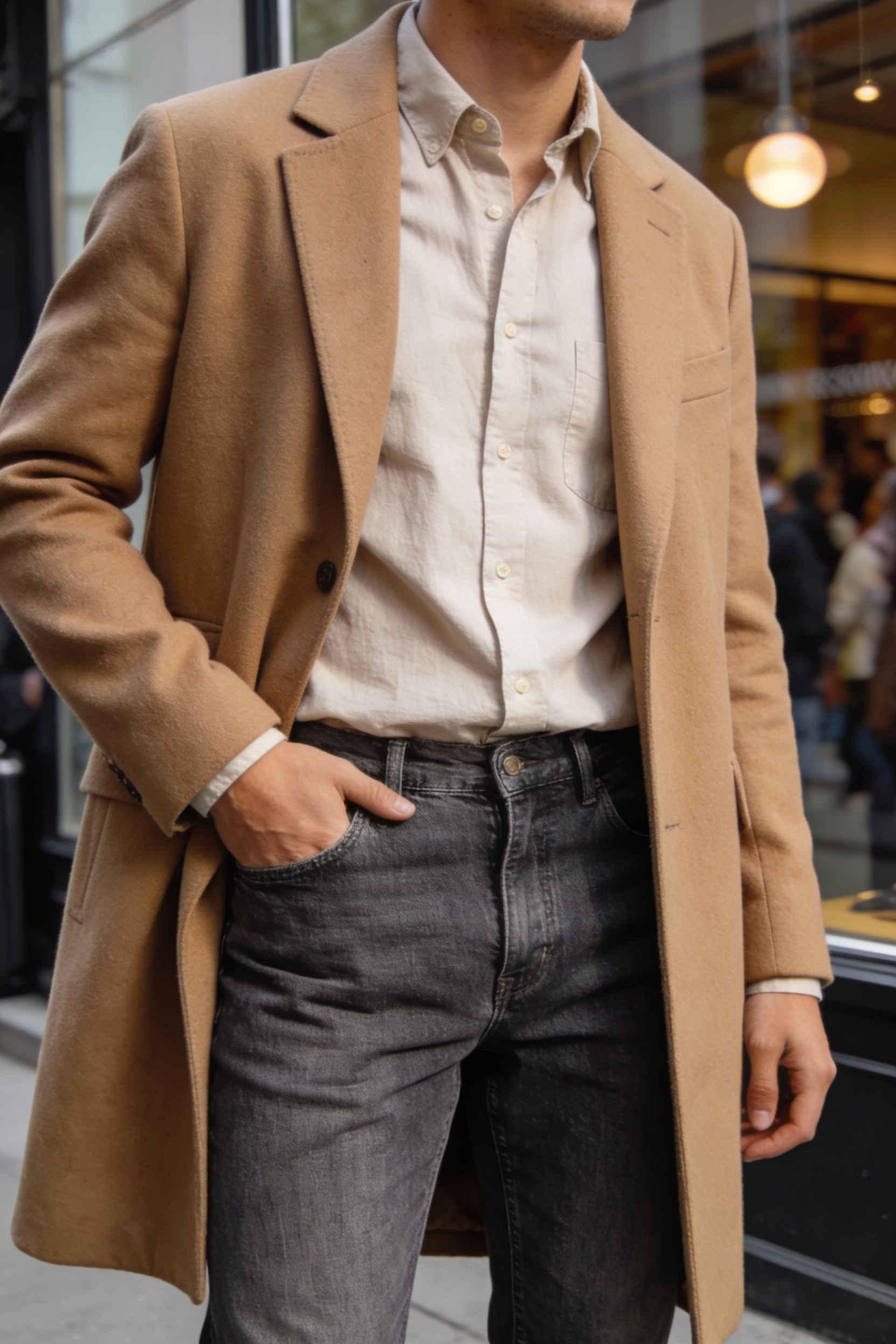 3) The Button-Down + Straight Jeans + Camel Coat Combo