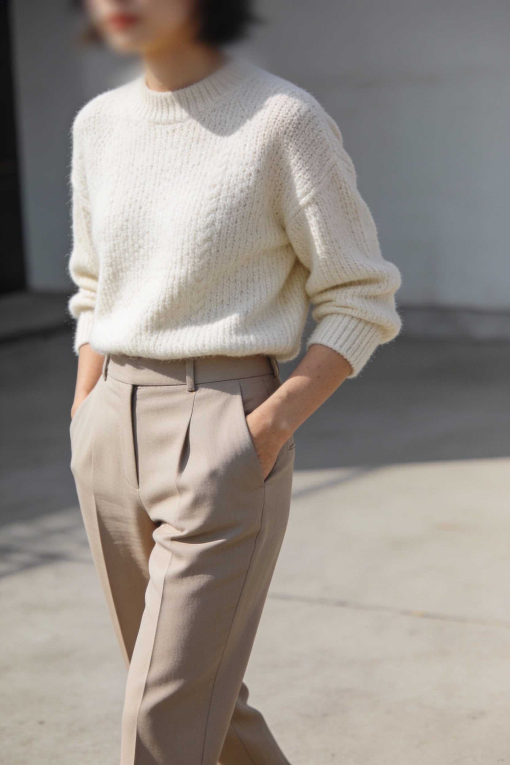 Pair a cream cotton-cashmere knit (slightly relaxed) with high-waisted tailored trousers in camel or black, then add a lightweight trench for instant structure. Finish with clean leather sneakers, a medium tote that fits your essentials, and simple gold hoop earrings. For comfort on the move, choose trousers with a little stretch or a hidden elastic back and keep a thin layer (like the trench) handy for chilly planes.