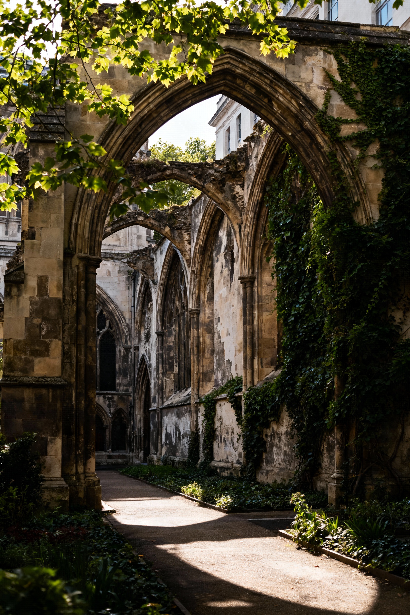 This ruined church turned leafy pocket garden is one of the most “how is this in the middle of London?” spots you’ll find. It’s best on a weekday morning when it’s quiet enough to hear the city soften around you. Combine it with a walk to Tower Bridge and the riverside for an easy half-day route, and pack a wide-angle lens (or just use 0.5x) to capture the arches and vines.