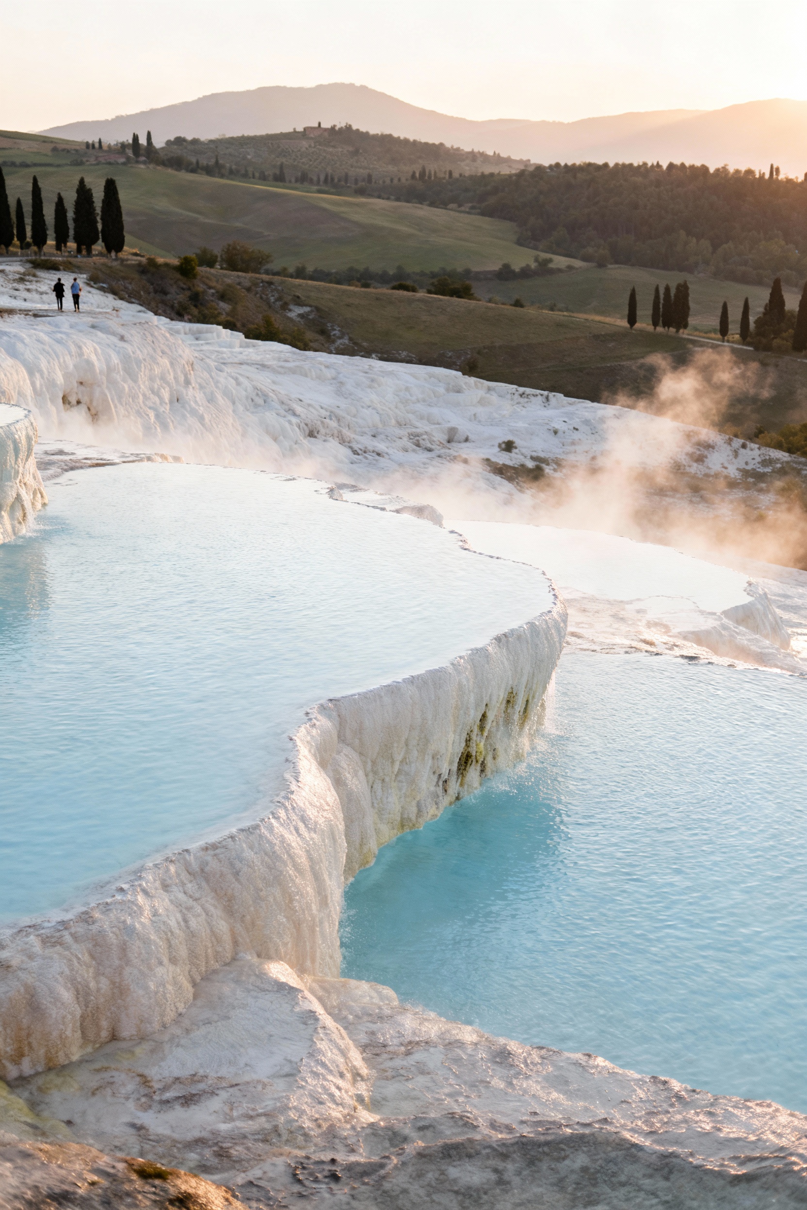 This is the iconic hill-country hot spring: milky-blue water terracing down limestone pools with Tuscany’s rolling landscape in the background. It’s free and open-air, but that also means crowds—arrive at sunrise for the most peaceful soak and the best photos. Pack a robe or oversized layer for warmth between dips (it can be chilly even in shoulder season), and bring a small bag for muddy shoes. If you’re road-tripping Tuscany, base yourself near Manciano so you can pop by early without a long drive.