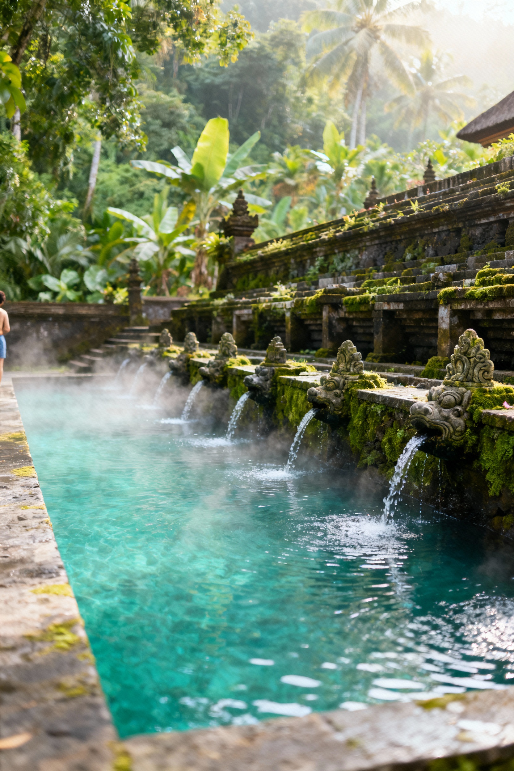 Tucked into the hills of North Bali near Lovina, Banjar is a lush, temple-like hot spring surrounded by tropical greenery. Go early (right at opening) to enjoy it before tour groups roll in, and pack water shoes—the stone can be slick. Pair it with a stop at nearby Brahmavihara-Arama (the Buddhist monastery) for a calm, scenic half-day. If you’re staying in the south, consider booking a driver for the day so you’re not stressing about long roads after a soak.