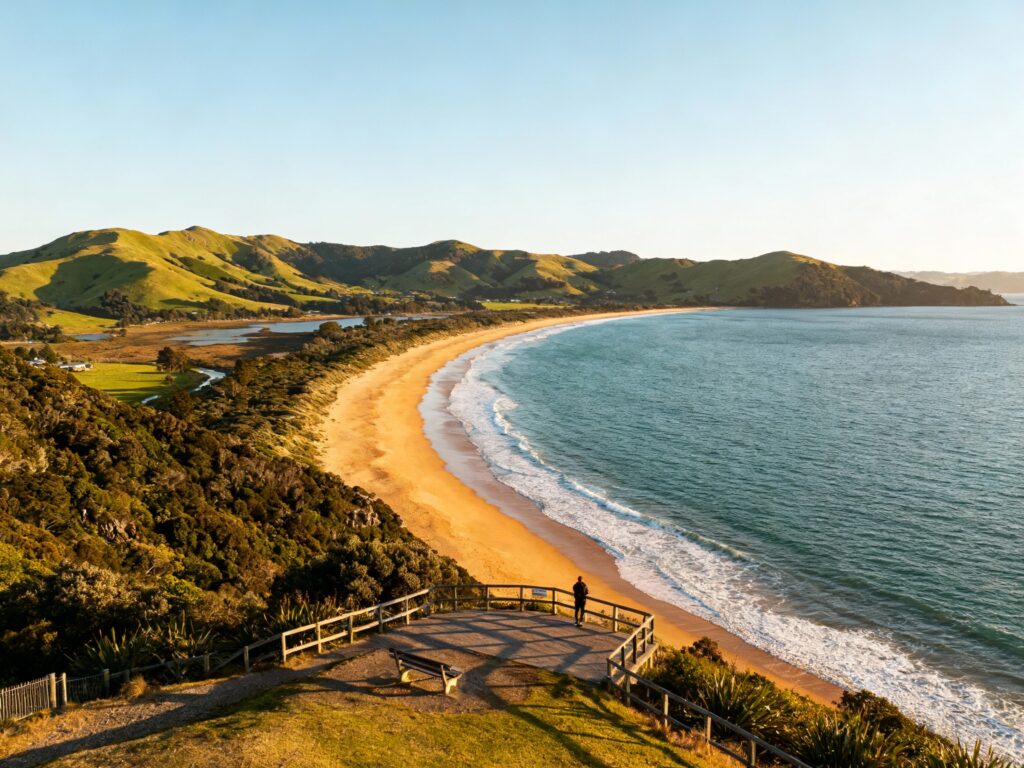 This is the classic Nelson beach shot: wide sand, calm water, and soft hills framing the bay. Go at golden hour for warm tones and easy silhouettes—sunset is best from the western end near the back beach. Pack a light jacket (the sea breeze shows up fast) and a lens cloth because salty air loves to fog cameras. If you’re staying central, it’s an easy bus/drive and a great “first day” spot to reset your body clock.