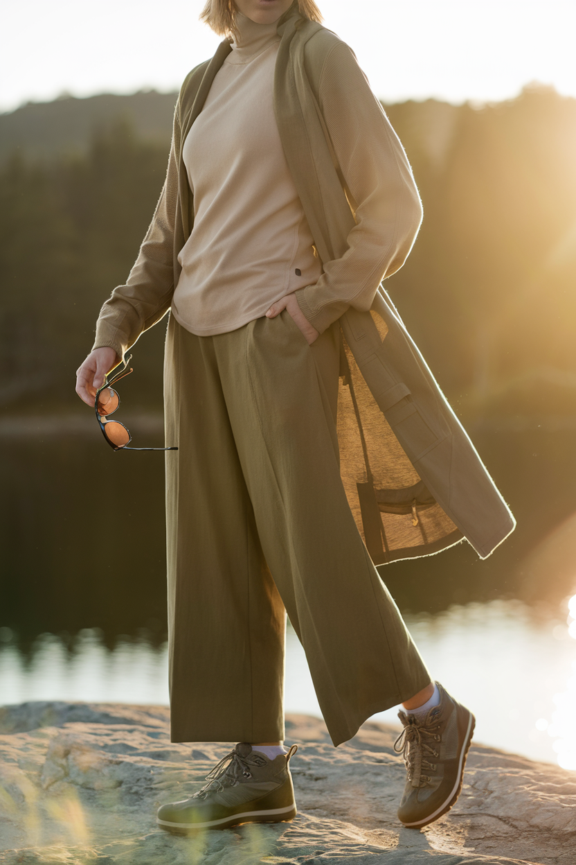 Try a sand-colored merino tee tucked into olive wide-leg travel pants, with a longline cardigan or light shacket for warmth once the sun dips. Add waterproof low-top hikers, a structured mini backpack, and polarized sunglasses to keep squinting out of your photos. Merino helps regulate temperature and doesn’t hold onto odors after a long day. Weather tip: skip slippery fashion sneakers—overlook paths can be dusty and uneven.