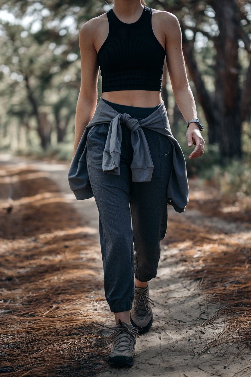 Go for a black ribbed tank with high-waist charcoal hiking joggers, plus a cropped fleece or zip hoodie you can tie around your waist when it warms up. Choose grippy hiking sandals or trail shoes (depending on your comfort with rocks), add a belt bag worn crossbody, and top it off with a baseball cap. Monochrome reads sleek in photos and doesn’t distract from the scenery. Weather tip: toss a thin thermal top in your bag if you’re shooting early morning.