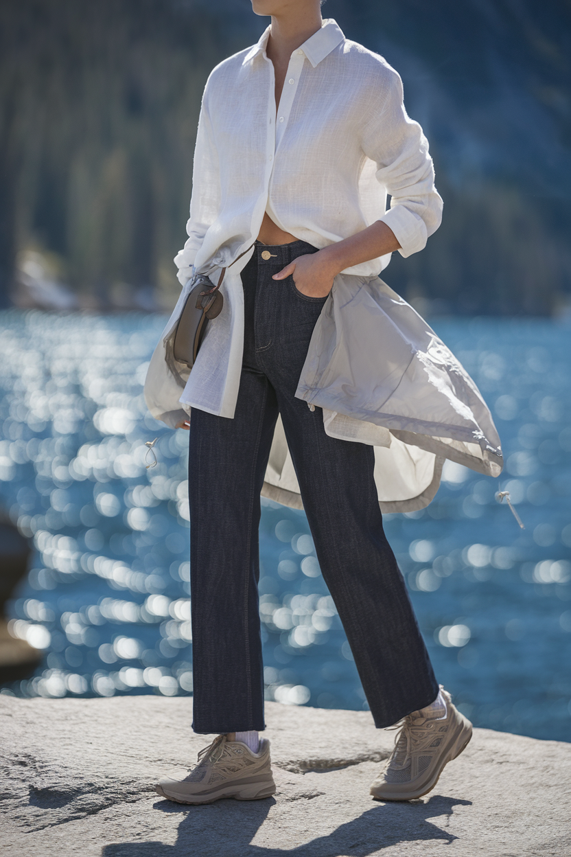 Wear a white linen button-down half-tucked into high-rise straight-leg dark denim, with a lightweight packable windbreaker on top for the overlook breeze. Finish with beige trail sneakers, a small crossbody bag that sits close to your body, and simple gold hoop earrings. Linen keeps you cool in the sun while denim photographs crisp against the blue water. Comfort tip: roll the sleeves and pack a hair tie—wind at the bay is not a cute surprise.
