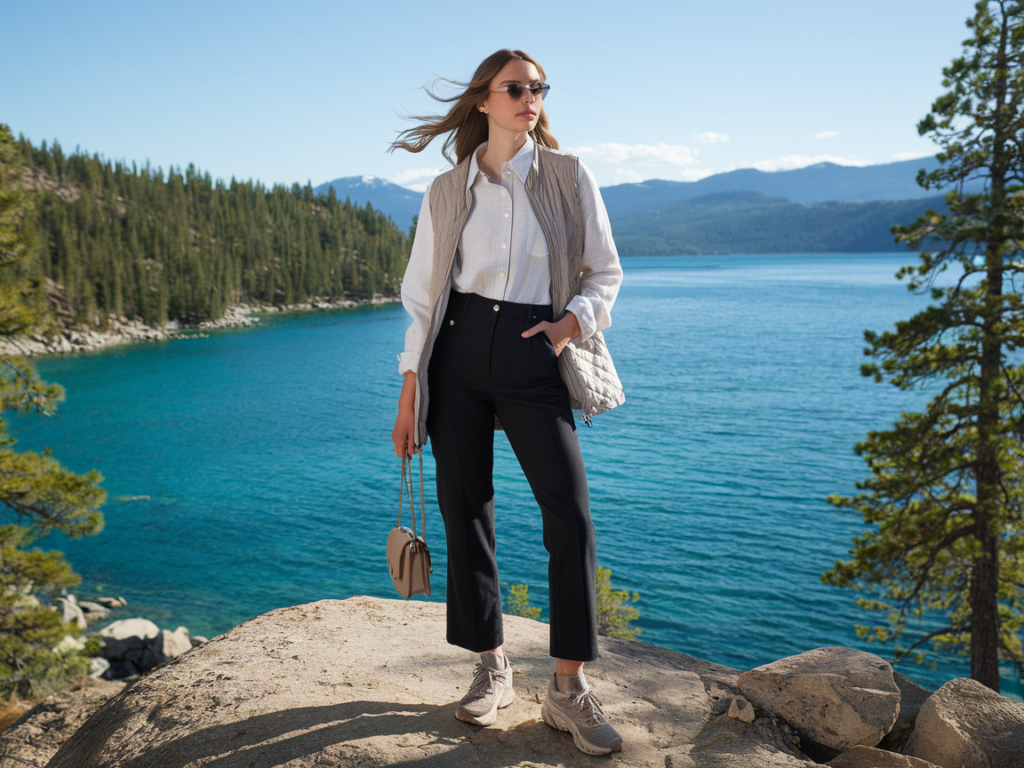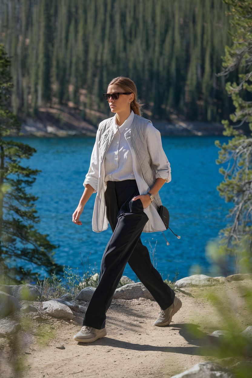 Pair a crisp white linen button-down with high-waisted black straight-leg pants, then add a lightweight quilted vest for those windy overlook moments. Finish with cushy trail sneakers, a small crossbody bag, and slim sunglasses as your one accessory. Linen looks airy in photos and won’t feel sticky if the sun comes out—just roll the sleeves and you’re good. Comfort tip: choose pants with a tiny bit of stretch so you can sit on boulders without tugging.