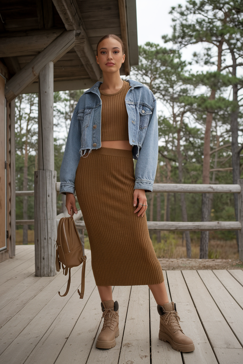 Go for a ribbed knit tank and matching midi skirt (or knit shorts if it’s warmer), topped with a cropped denim jacket for structure on camera. Add lug-sole ankle boots for grip, a mini backpack for hands-free hiking, and a simple gold hoop earring as your accessory. Knit reads cozy and elevated against forest backdrops, and the denim jacket blocks surprise breezes near the water. Weather tip: avoid super-thin knits that go sheer in bright sun—look for medium-weight ribbing.