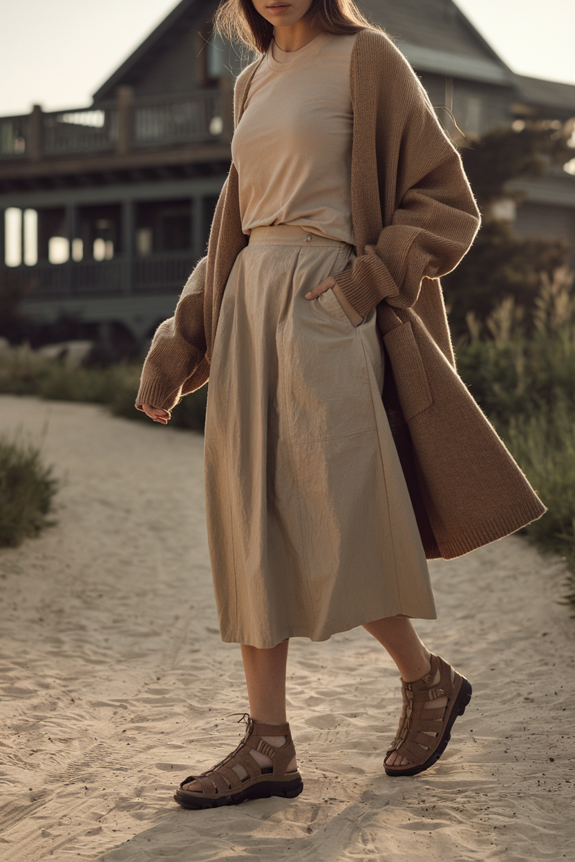 Style a soft cotton tee tucked into a sand-colored midi skirt or lightweight utility skirt, then layer a camel cardigan or shacket for that warm, vintage lodge feel. Finish with leather (or faux leather) hiking sandals with good traction, a woven tote, and a silk scarf tied at your ponytail as the accessory. Neutrals look amazing against the lake’s blues and the castle-like architecture. Weather tip: if it’s cooler, swap sandals for low-top hiking shoes and keep the scarf for warmth.