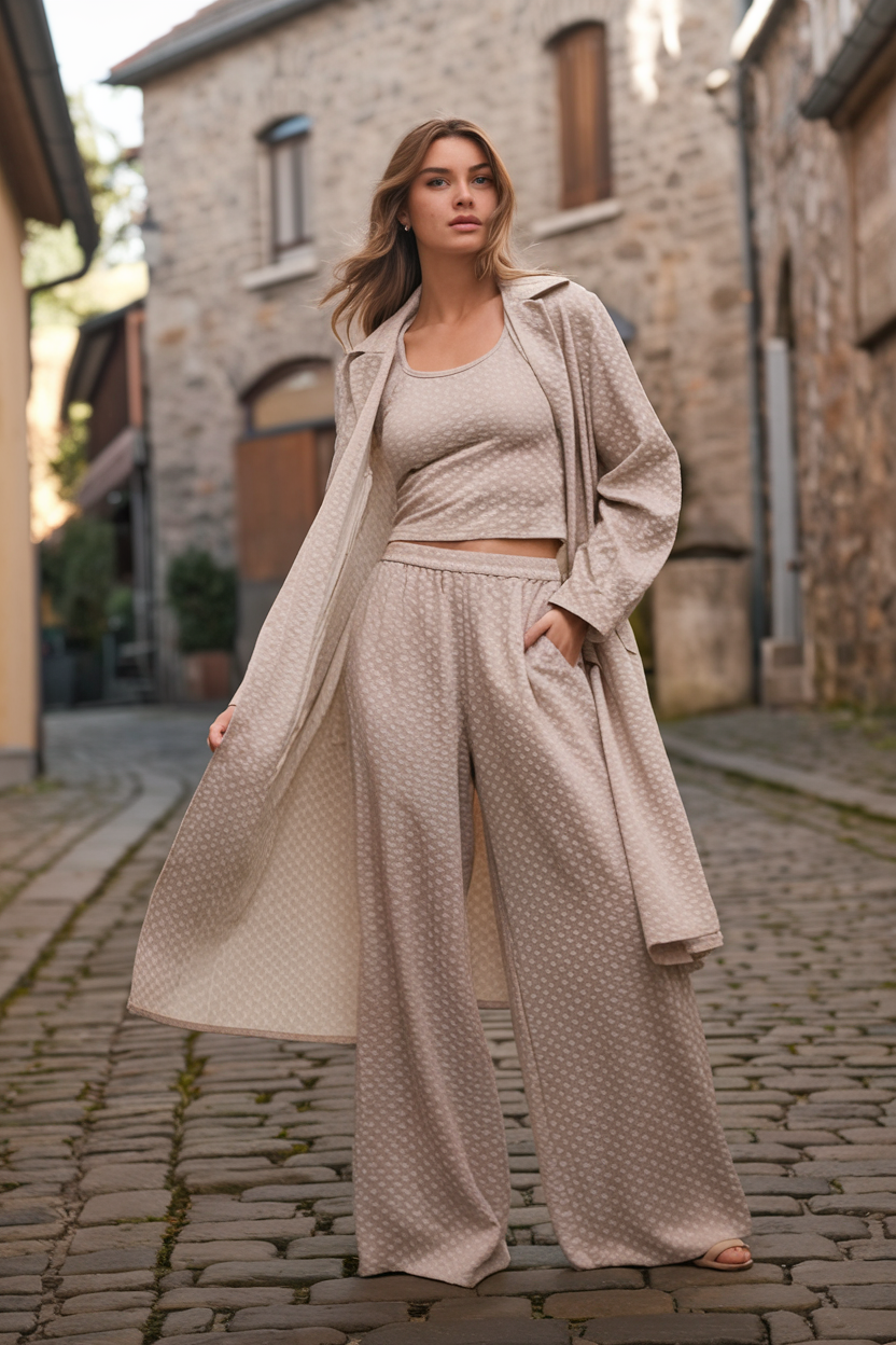 A matching set instantly looks styled: try a knit tank with high-waisted wide-leg pants in a breathable viscose blend or lightweight cotton. Toss on an oversized linen shirt as your outer layer, then add slide sandals, a structured tote, and a dainty pendant necklace. This one’s amazing for travel days because the wide leg keeps you cool while still looking elevated. Avoid pants that are too long—they’ll drag and get grimy on city streets.