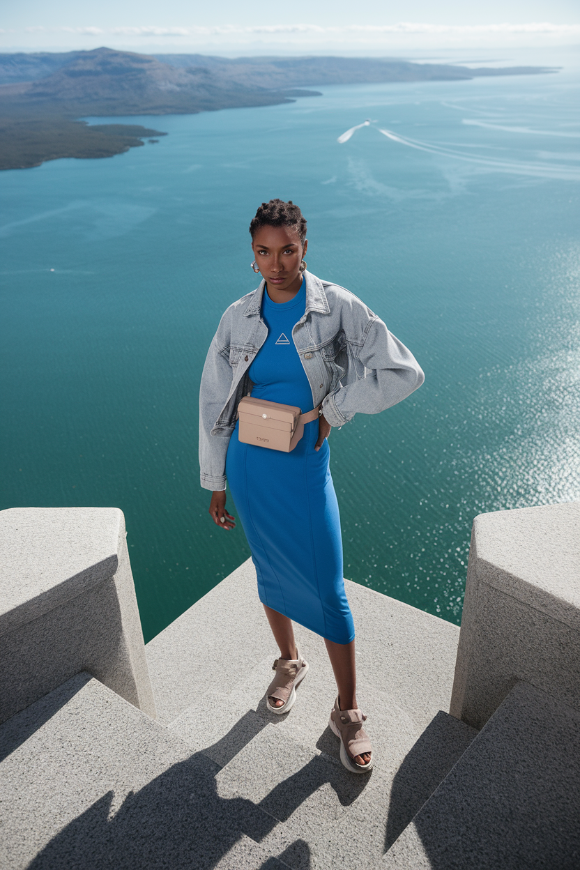 Pick a sporty midi dress in a performance knit (or a cotton-blend jersey) and layer a cropped denim jacket or light shacket on top. Add comfy walking sandals with a secure strap (or low-profile sneakers), a crossbody belt bag, and a silk scarf you can wear on your hair or neck. Weather tip: if it’s windy, avoid flimsy flip-flops and go for straps so you’re not gripping with your toes all day.