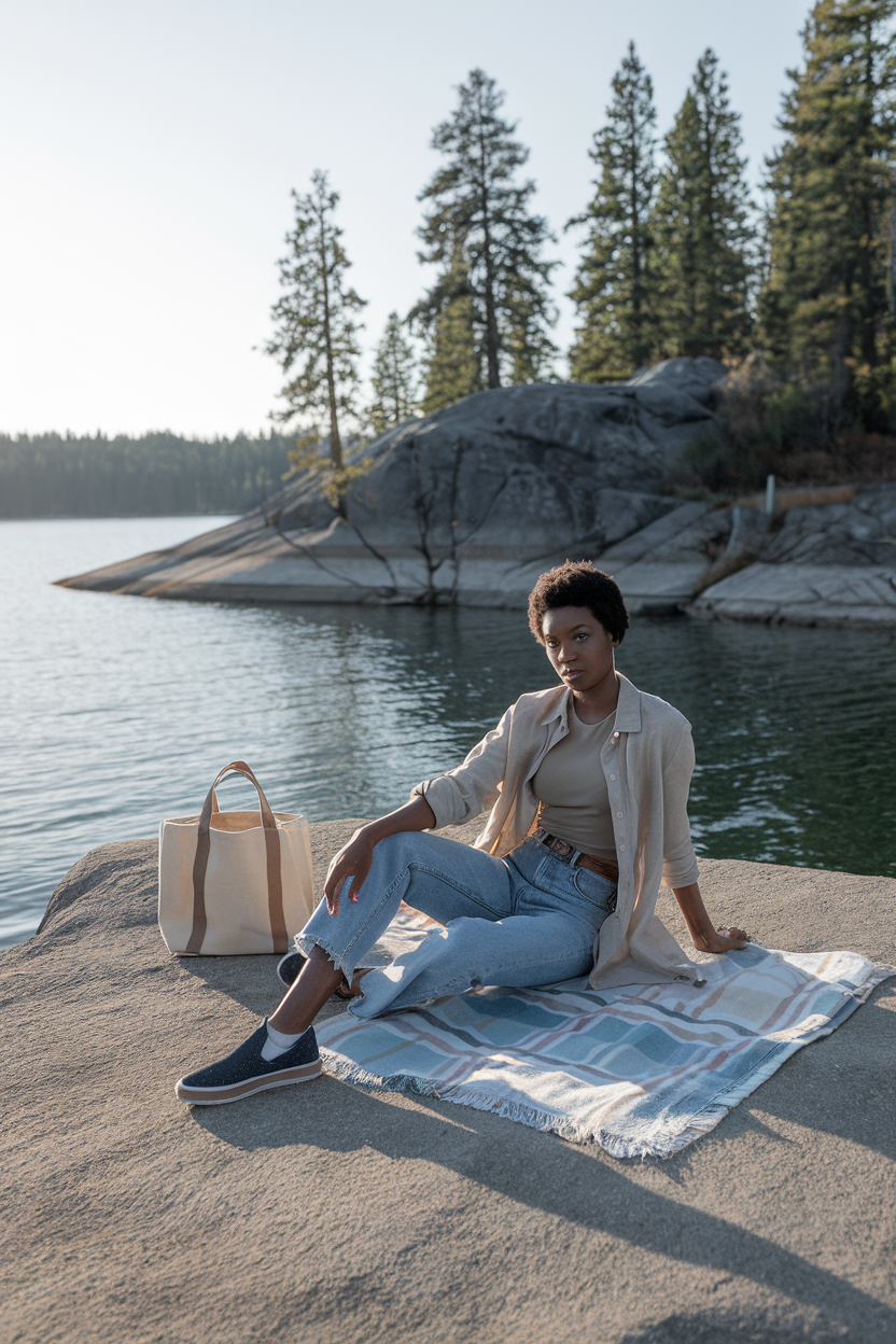 Try a linen-blend button-up over a fitted tee with straight-leg jeans (or ankle cargos), and bring a thin cardigan you can tie in your bag. Pair with supportive slip-on sneakers, a canvas tote for a picnic blanket, and a simple gold hoop earring to look polished fast. Comfort tip: choose jeans with 1–2% elastane so sitting on rocks or benches doesn’t feel stiff.