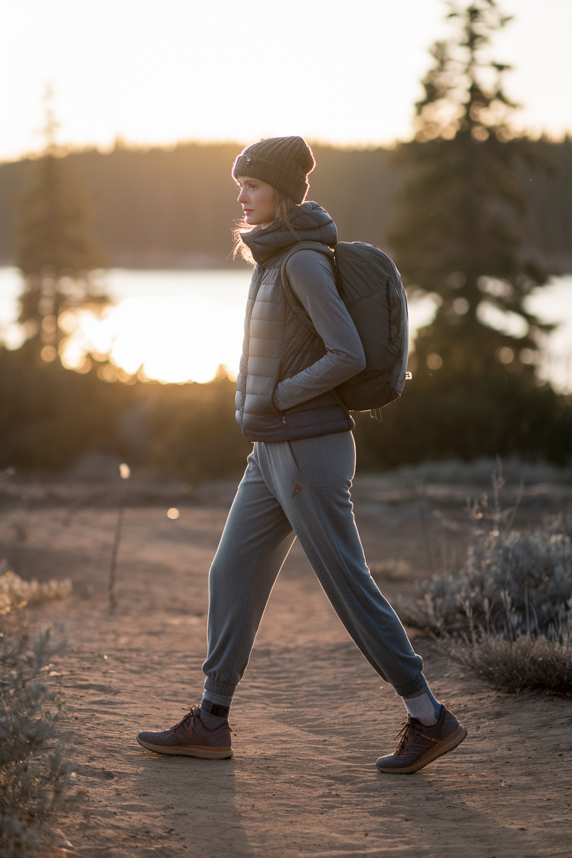 Do a soft merino or thermal long-sleeve with relaxed joggers, plus a packable puffer vest for golden hour when temps drop. Finish with warm socks and trail runners, a small backpack, and a beanie for extra cozy points. Comfort tip: stick to darker joggers if you’ll sit on ledges—light colors show dust fast.