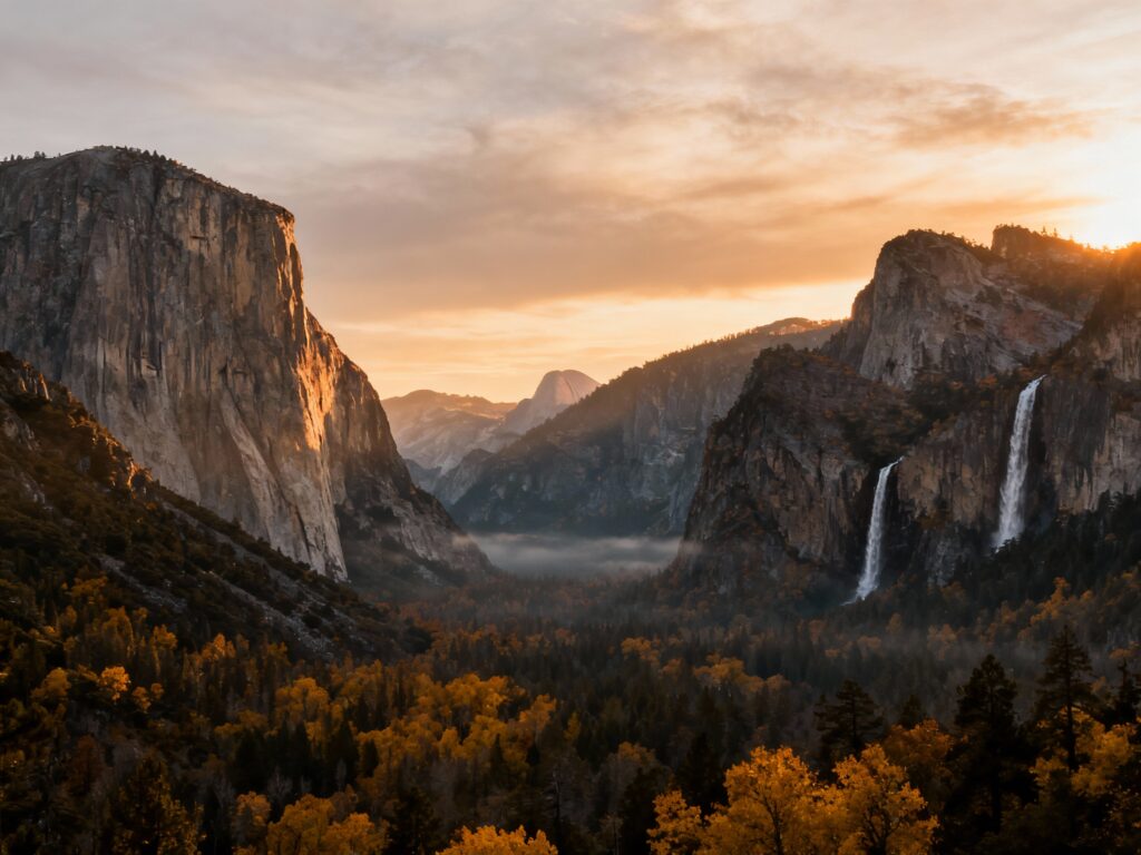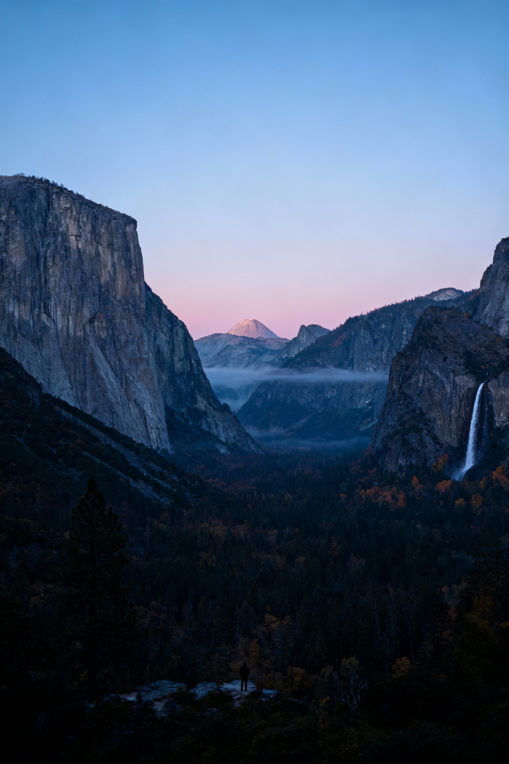 This is the iconic Yosemite postcard view: El Capitan on the left, Bridalveil Fall on the right, and Half Dome peeking in the distance. In October, arrive 30–45 minutes before sunrise for that soft, pastel glow and fewer cars fighting for the front rail. Pack a tripod for low light and bring a lens cloth—cold mornings can fog up glass fast. If you’re staying outside the park, leave earlier than you think; it’s worth it for the calm, empty-vibe shots.