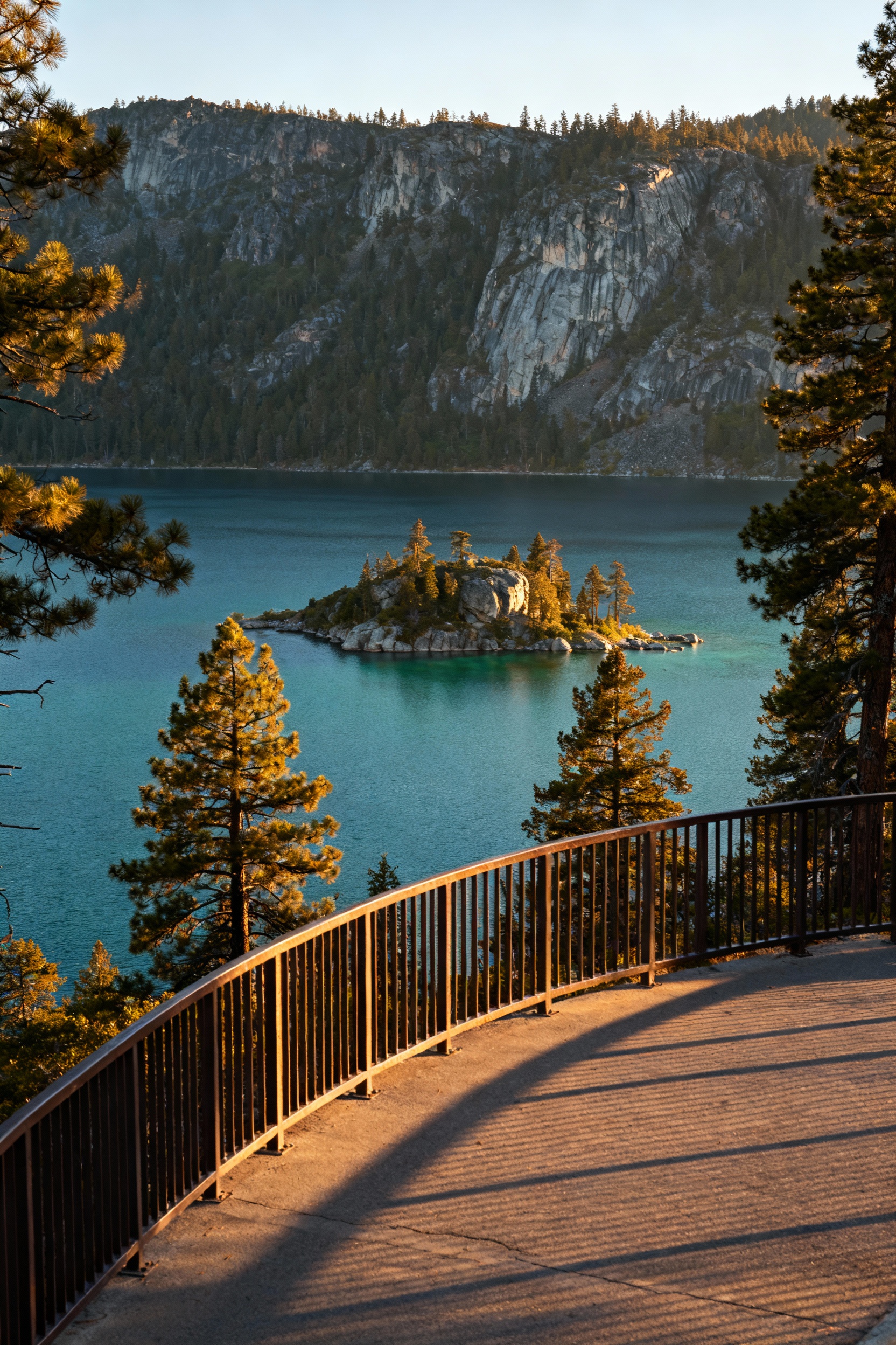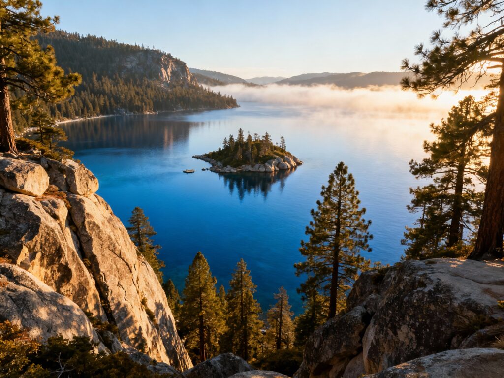 This is the fastest payoff in the park: park at the Emerald Bay State Park lookout on Highway 89 and walk a short, mostly flat path to the classic viewpoint. Go at sunrise for glassy water and way fewer people; midday can feel like a mini-festival. Pack a light jacket even in summer—wind off the bay is real. If the lot is full, do a quick loop to nearby pullouts and return; spots turn over quickly.