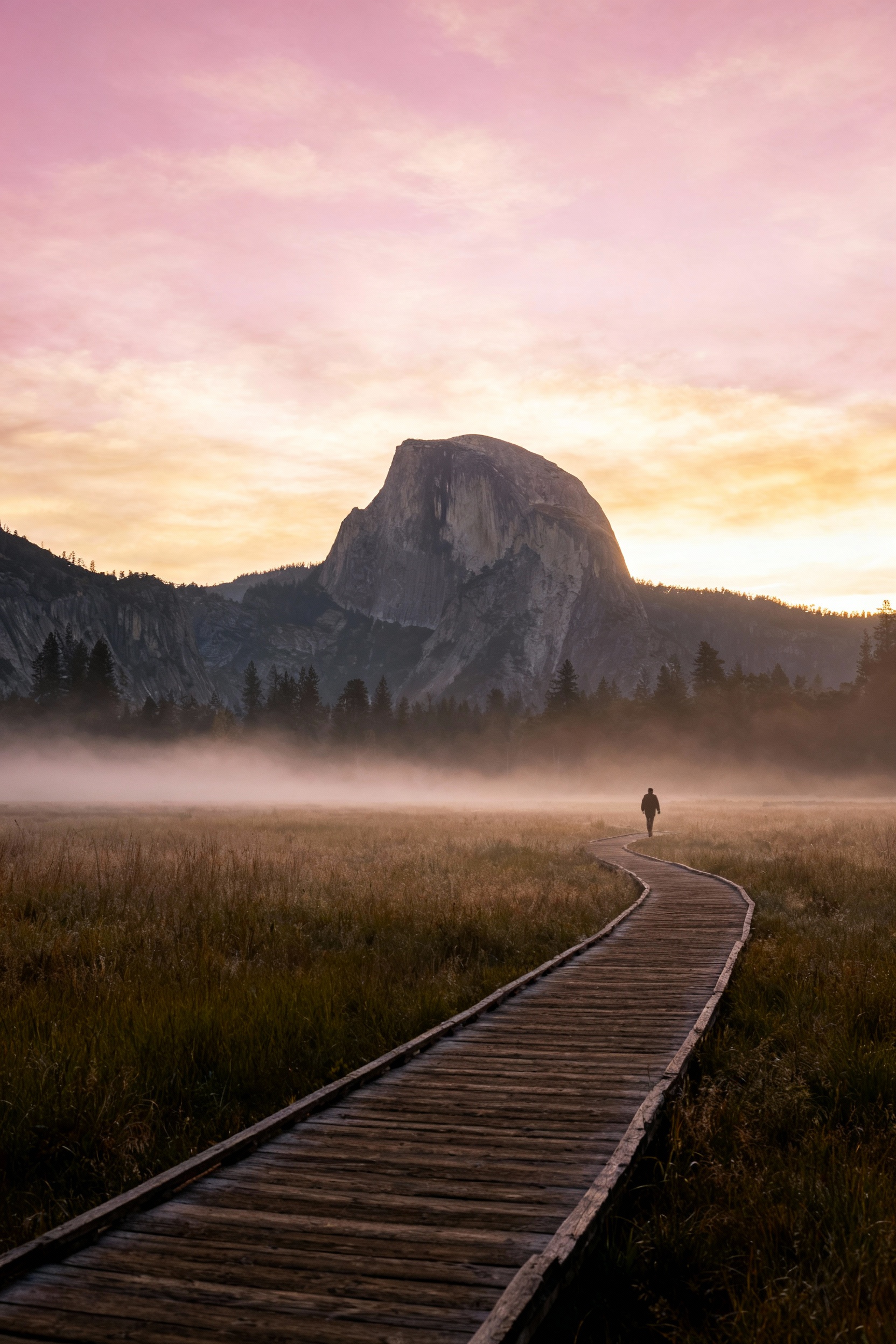 For a peaceful, “wide-open meadow” sunrise with Half Dome floating in the distance, Cook’s Meadow is a low-effort, high-reward option. Start at one of the Yosemite Valley shuttle stops nearby and walk the flat boardwalk/paths about 30 minutes before sunrise so you can pick a composition without rushing. Bring a wide lens for the full scene and a telephoto (70–200mm) if you want to compress the layers of trees and granite. This is also one of the best places to shoot misty mornings—pack a microfiber cloth because your lens can fog up fast.
