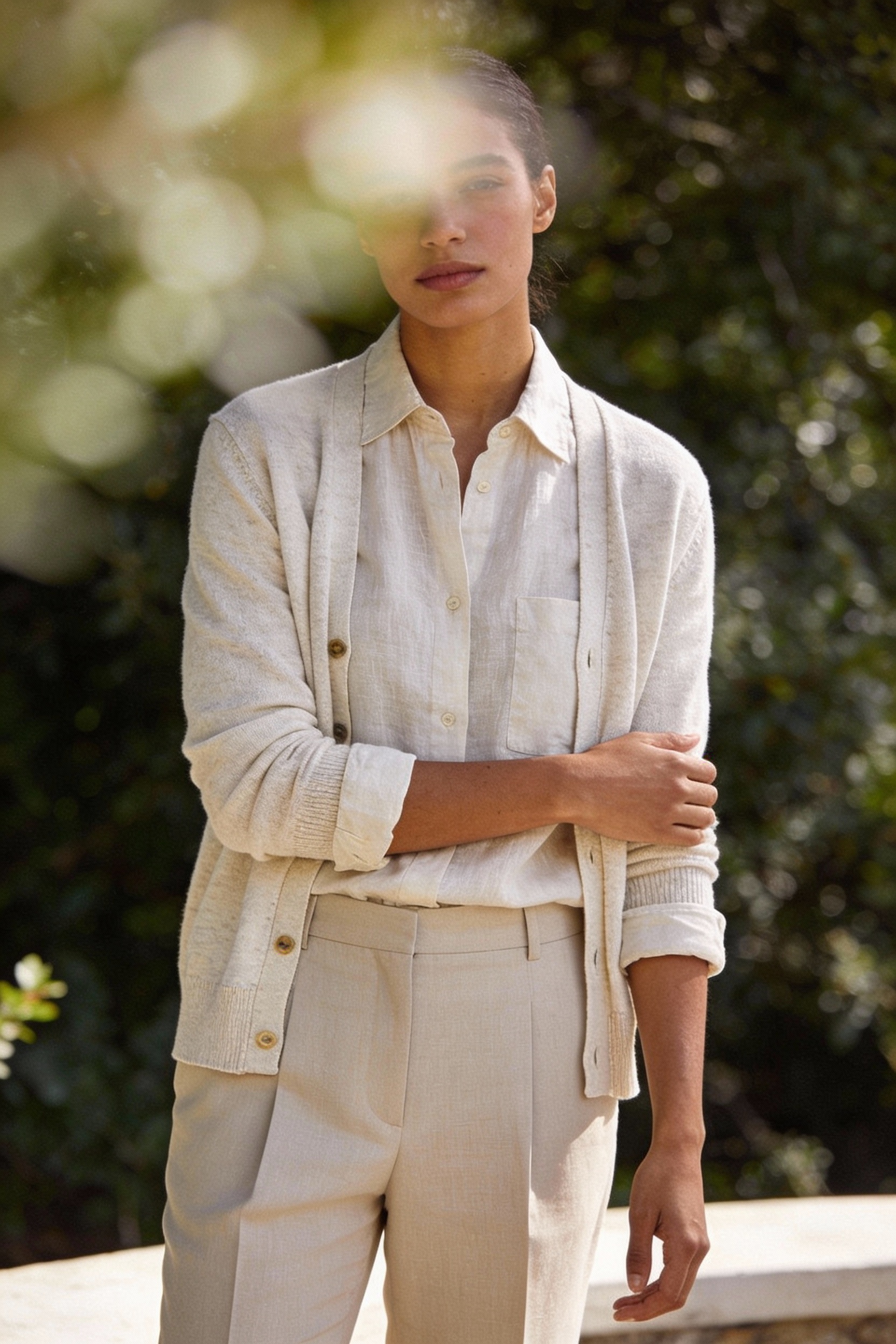Wear a relaxed linen button-down (half-tucked) with linen shorts or airy linen trousers, and layer a thin cotton crewneck sweater over your shoulders for breezy evenings. Add flat leather sandals, a woven crossbody bag, and a straw or canvas baseball cap for sun coverage. Stick to light colors for heat, but avoid super-sheer linen—go for a slightly heavier weave so it looks polished.