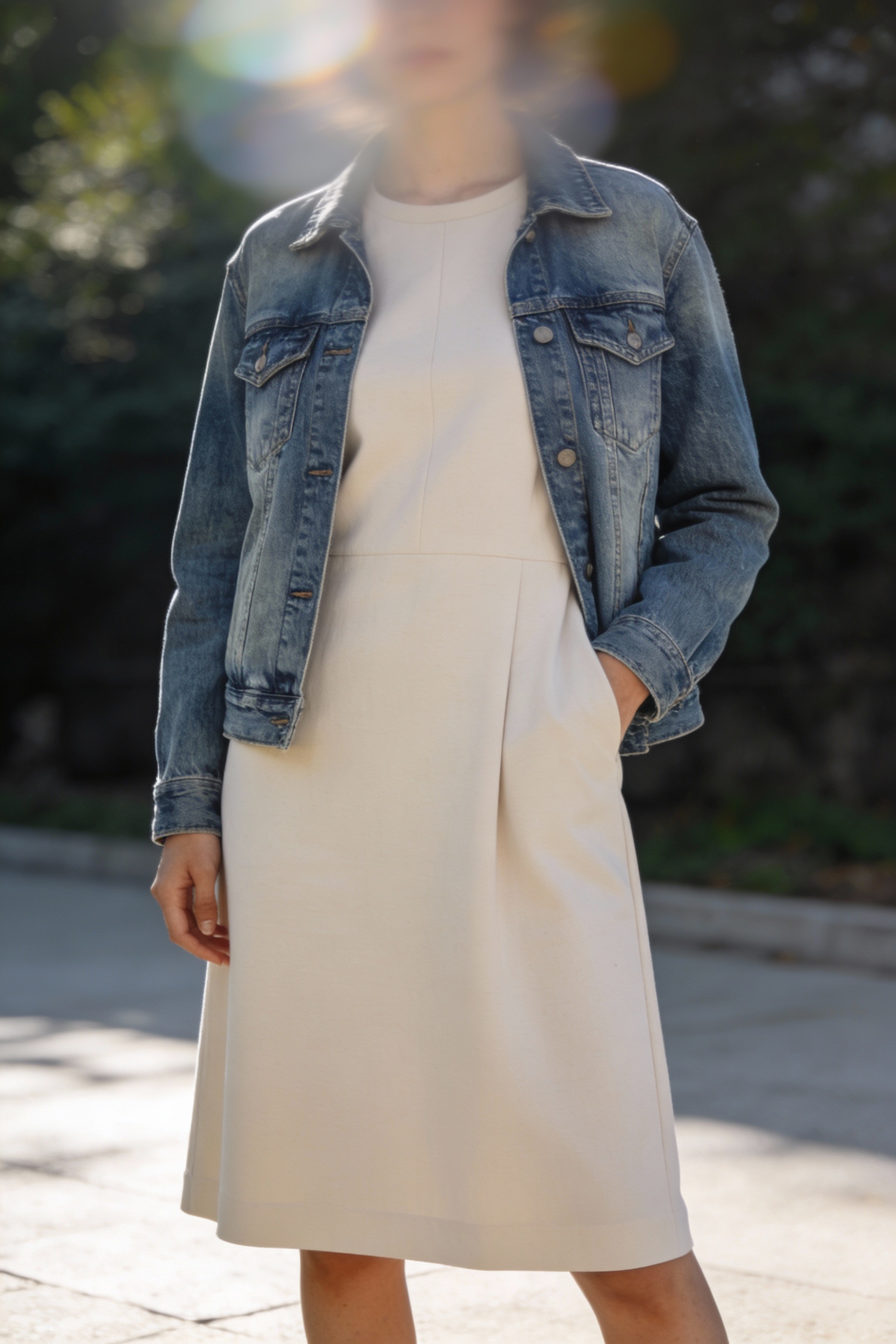 Go for a jersey or rib-knit midi dress that skims (not clings), topped with a classic denim jacket for structure and pockets. Add sleek slip-on sneakers or supportive flats, a small backpack for hands-free boarding, and a lightweight scarf that doubles as a blanket on the plane. This outfit is a one-piece win when you want to look “done” with minimal effort. For warmer climates, choose a short-sleeve dress and keep the jacket tied to your bag until the cabin chill hits.