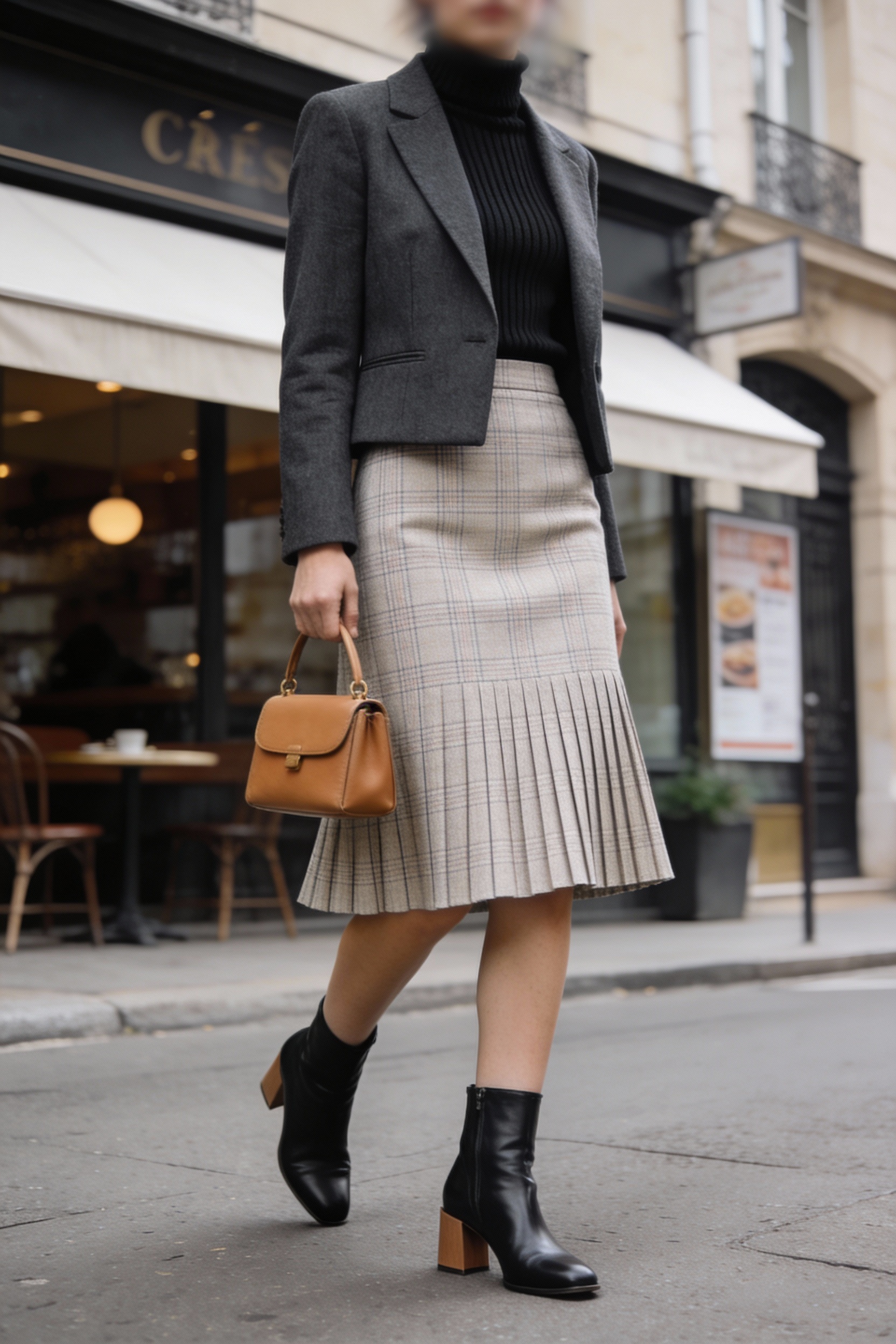 Go for a fitted ribbed turtleneck tucked into an A-line midi skirt in a solid or subtle check, and layer a short, structured blazer or a knit jacket on top. Keep the look grounded with low block-heel ankle boots, a top-handle satchel, and small gold hoop earrings as the accessory. This outfit is great for museums and dinners because it’s polished but comfortable. Comfort tip: bring opaque tights for warmth and to prevent boot rub on long walking days.