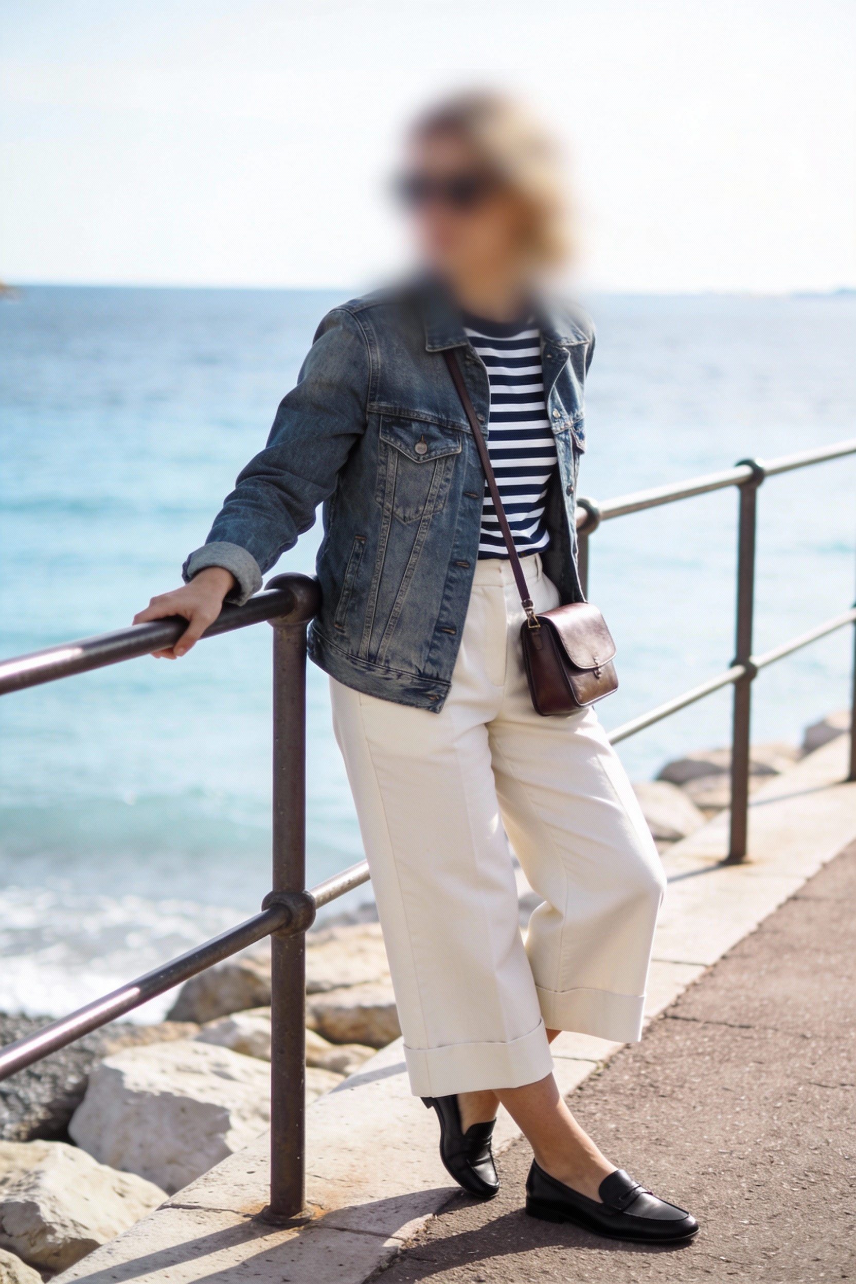 Pair a Breton striped tee with cropped wide-leg trousers for that retro, Riviera-inspired balance, then top it with a modern denim jacket or a sleek cardigan for chilly planes. Add loafers (or slim ballet flats with a tiny heel) and a small tote that fits a water bottle and scarf, plus a simple silk neck scarf as your accessory. Choose mid-rise trousers with a bit of stretch for long train rides. Weather tip: swap the denim jacket for a packable rain shell if you’re heading somewhere unpredictable.