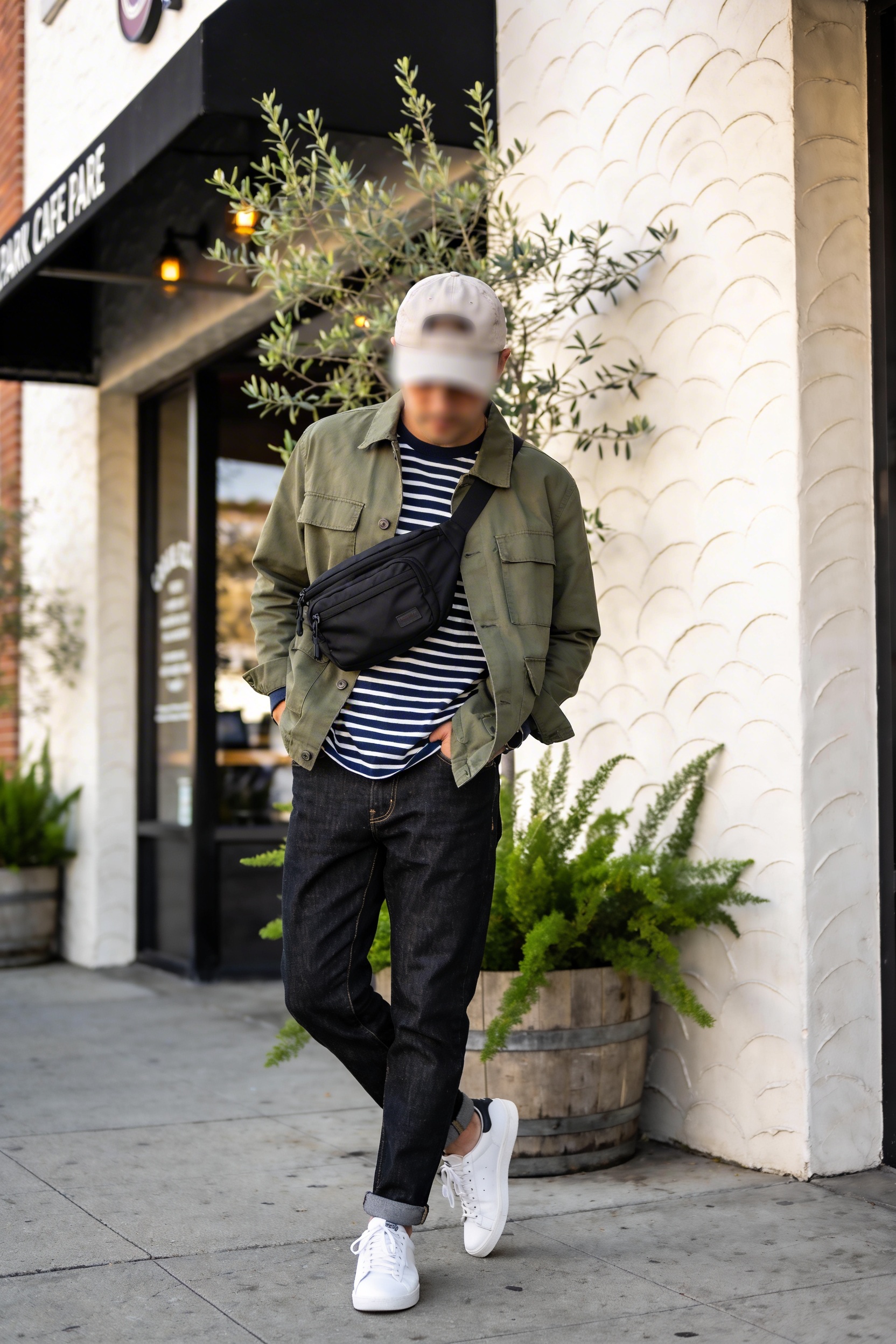 Try a striped cotton tee with straight-leg dark jeans and a relaxed utility jacket for that casual-cool neighborhood vibe. Add classic white sneakers, a medium nylon belt bag or compact backpack, and a baseball cap as your accessory for sun and low-effort styling. This works for record shops, breweries, and walking between cafés in North Park. Comfort tip: wear no-show socks and bring a light jacket you can tie around your waist if it warms up.