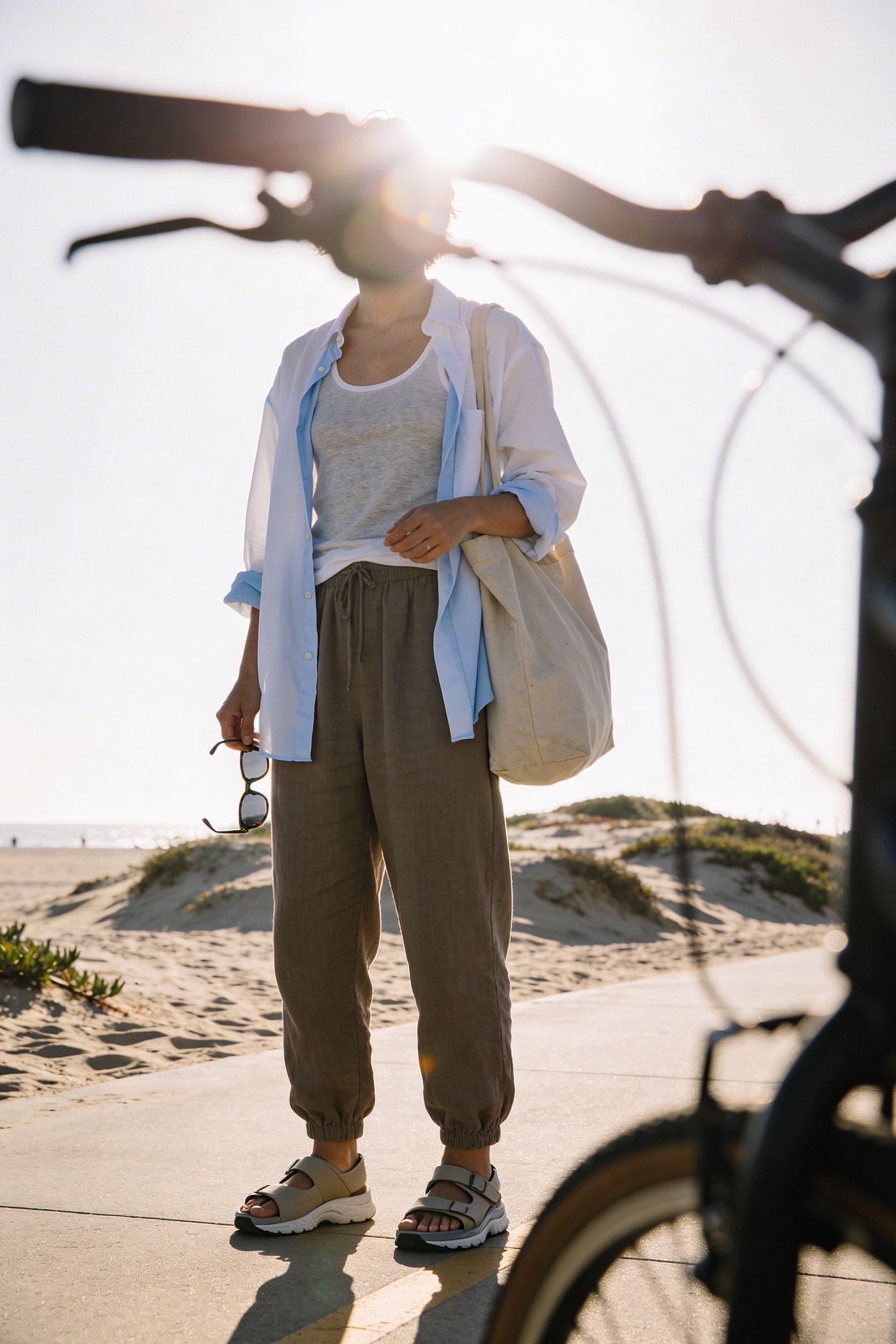 Wear a soft cotton tank with relaxed pull-on joggers or linen-blend pants, then toss on an oversized button-up as a sun layer. Add sporty sandals with arch support (or slip-on sneakers if you’ll bike), a roomy tote, and polarized sunglasses as your accessory. It’s an easy fit for Coronado paths, the ferry area, and a casual beach picnic. Comfort tip: choose quick-dry fabrics if you might end up near the water or in sand.
