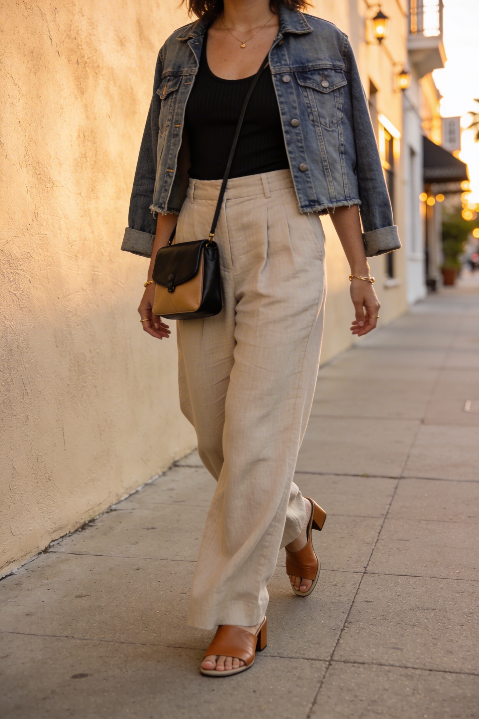 Go for a black ribbed tank tucked into wide-leg linen trousers, then add a cropped denim jacket for evening patio dining. Finish with low block-heel sandals (or sleek flats if you’ll walk a lot), a small crossbody bag, and a silk scarf tied on your bag handle as the accessory. It’s polished enough for Little Italy restaurants without feeling fussy. Weather tip: linen keeps you cool early, and the jacket saves you when the marine layer rolls in.