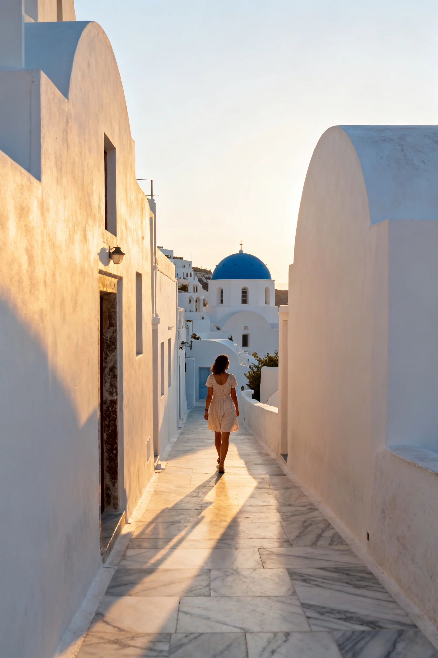 Oia is iconic, but the real magic is early—think 7:00–9:00 a.m., when the alleys are quiet and the light is soft. Start near the blue domes and wander down the side lanes toward the old castle area, then grab breakfast before tour groups roll in. Wear grippy sandals because the marble steps get slick, and pack a light layer even in summer mornings. If you want those postcard photos, stay in Oia or book a private early-morning photo session instead of chasing sunset crowds.